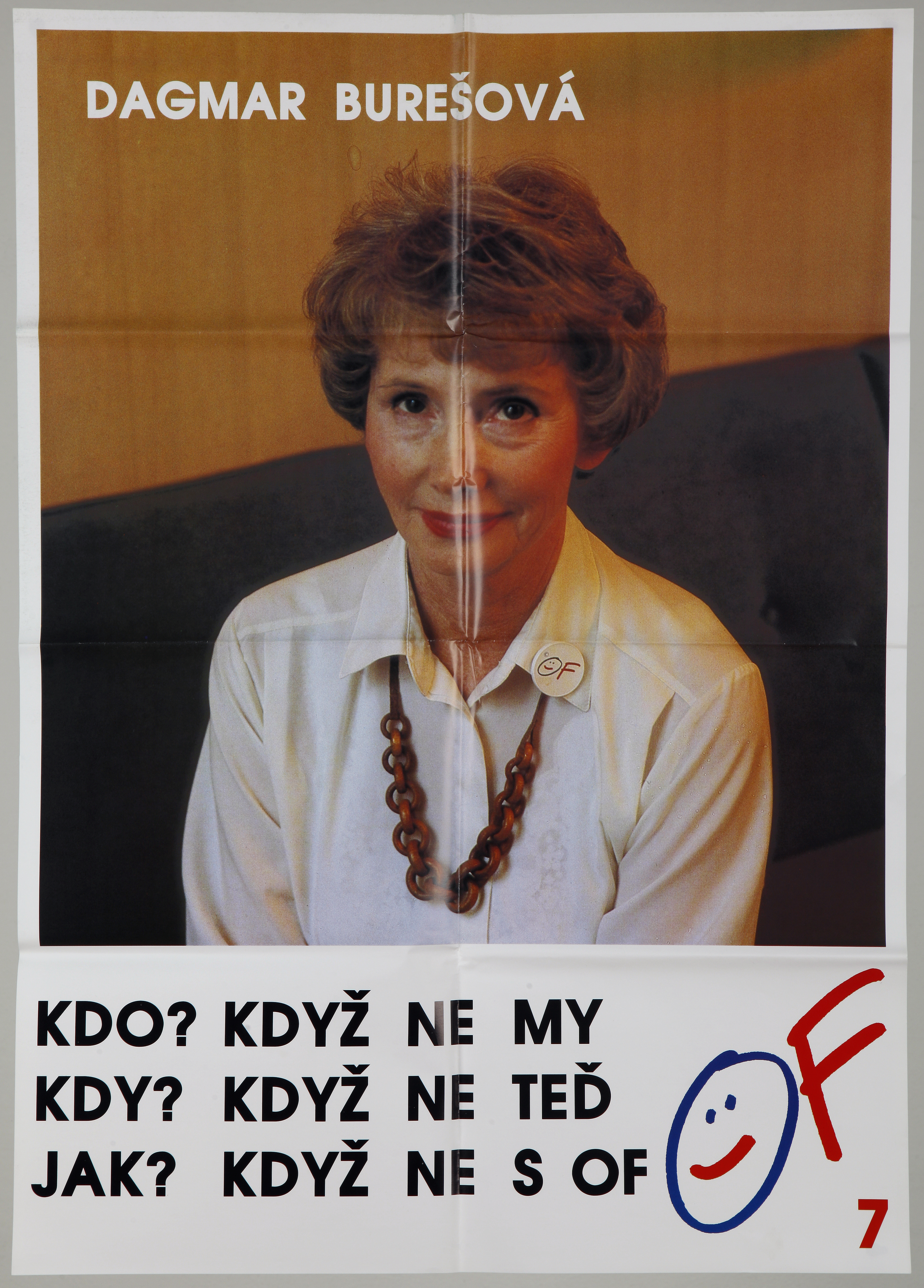 Plakát OF k volbám r. 1990 s portrétem Dagmar Burešové s nápisem: Kdo? Když ne my Kdy? Když ne teď Jak? Když ne s OF