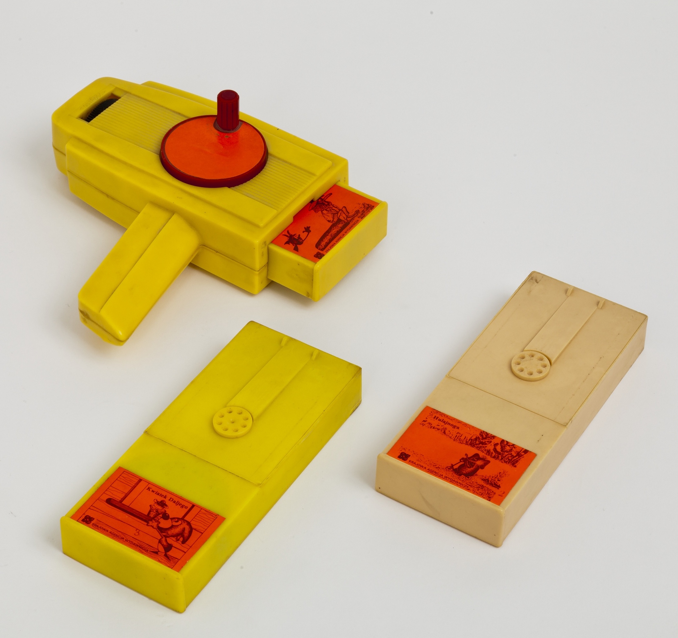 žlutá plastová kamera s dvěma zásobníky. Název "Kinoplastikon"