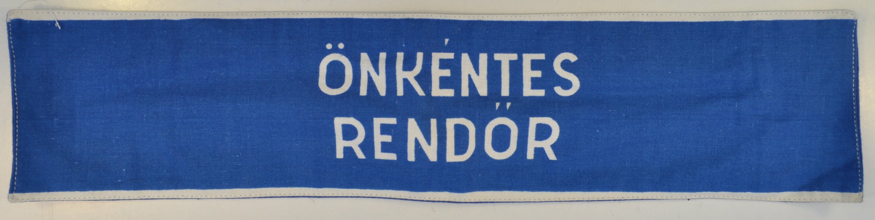 Kék színű, vászonból készült, önkéntes rendőr karszalag.