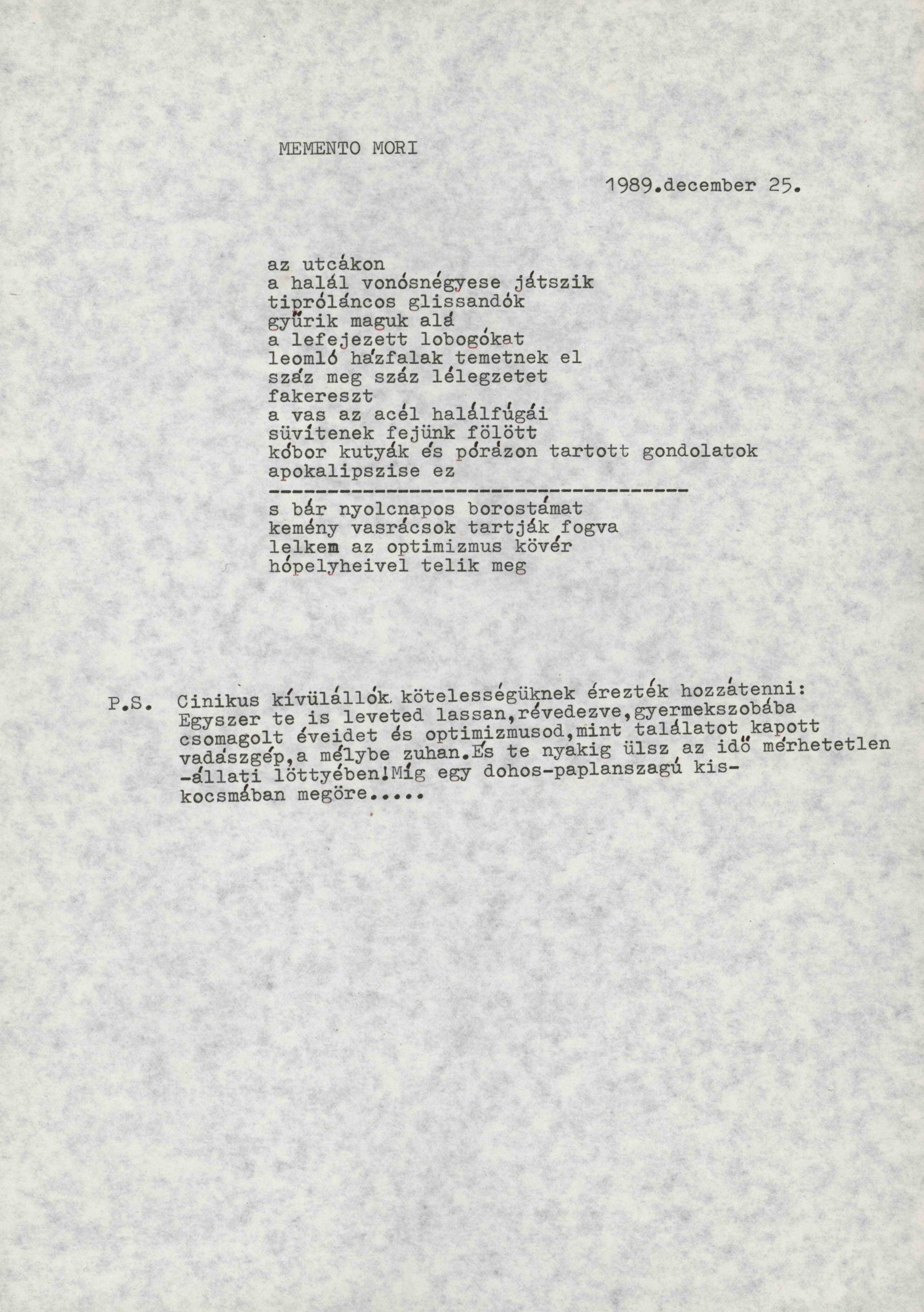Optional keywords (Europeana1989): Geolocation (spatial coverage): Time scope (temporal coverage): Description:1989. december 25-én, Marosvásárhelyen született vers géppel írt kézirata.