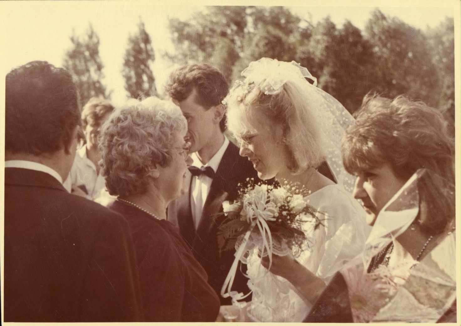 Zdjęcie panny młodej przyjmującej życzenia od rodziny