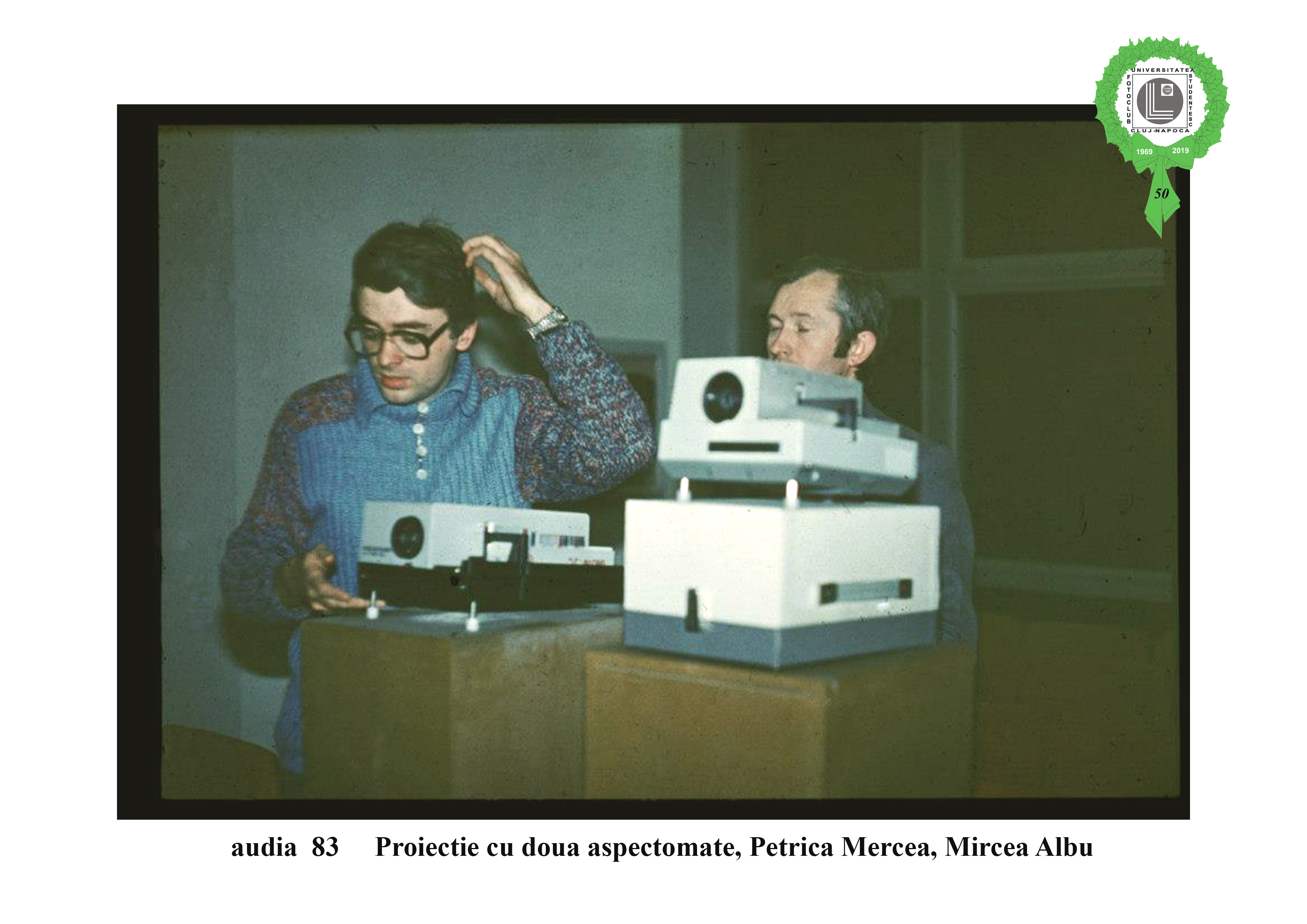 Proiecție cu două aspectomate, Audia 1983, Cluj-Napoca, cu Petrica Mercea și Mircea Albu. Diaporamele digitale sunt lucrări complexe de imagine, sunet, text, concepute de către autori, artişti fotografi, cu intenţia de a transmite publicului, sentimente şi trăiri percepute în periplurile lor creative. AUDIA , una dintre puţinele manifestări artistice de acest gen din lume şi singura din România a fost iniţiată şi organizată pentru prima dată în anul 1974 de către Fotoclubul “Universitatea” Cluj-Napoca, preluată de către Asociaţia ArtImage Cluj-Napoca în anul 2006.