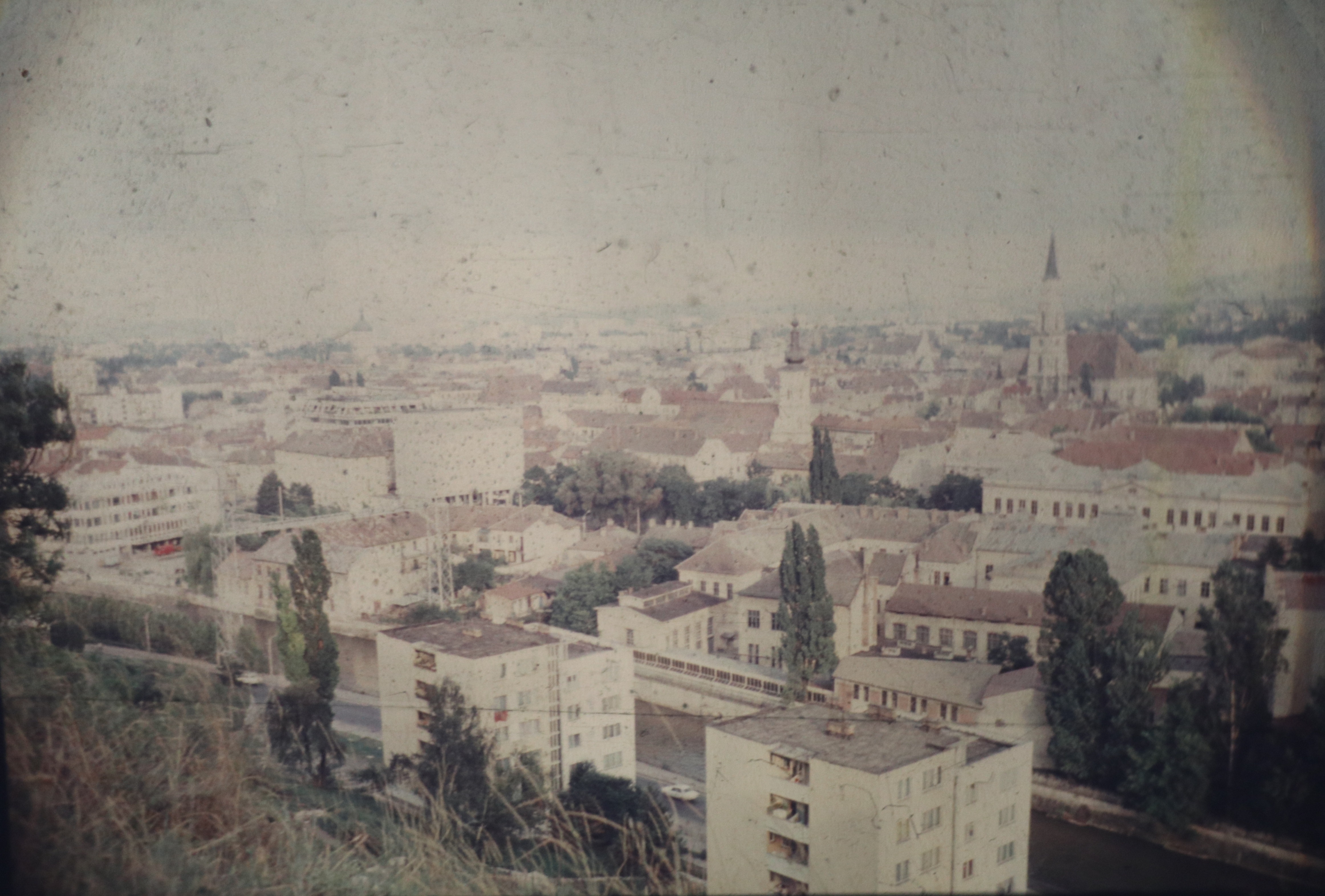 Fotografia a fost prelucrată după un diapozitiv și a fost realizată în vara anului 1988 de pe Cetățuie. Cetățuia Cluj este o fortificație habsburgică construită între anii 1715 – 1735, după planurile arhitectului militar Giovanni M. Visconti. Cu ziduri sub formă de stea, vechea fortificație cuprindea o redută și un turn, fiind înconjurată de bastioane, iar în exterior era împrejmuită de un val de pământ. Ridicată cu scopul de a asigura un post de apărare, precum și un punct de control al trupelor austriace asupra orașului, Cetatea Norilor, cum a mai fost numită, a fost de multe ori folosită și ca închisoare, mai ales în perioada Revoluției de la 1848. Aici, în anul 1849, unul dintre eroii Revoluției, pastorul sas Stephan Ludwig Roth, a fost întemnițat și executat. Ridicarea hotelului Belvedere, în anii ’70, a adus cu sine o notă de modernitate, dar, totodată, a dus și la demolarea clădirilor de pe latura sudică a cetății. În zilele noastre, din vechea cetățuie a mai rămas puțin: porțile de acces din sud-est și nord, o parte din ziduri, câteva clădiri și reduta, transformată între timp în Turnul Parașutiștilor. În anul 1995, pe Cetățuia Cluj, a fost înălțată o imensă cruce din fier, în locul celei distruse în perioada comunismului, în anii ’50, care a fost inițial ridicată în memoria celor întemnițați aici. Cetățuia este cu siguranță unul dintre cele mai vizitate obiective turistice din Cluj, atât pentru valoarea istorică pe care o are, cât și pentru minunata priveliște panoramică de care te poți bucura odată ajuns sus, pe zidurile ei.