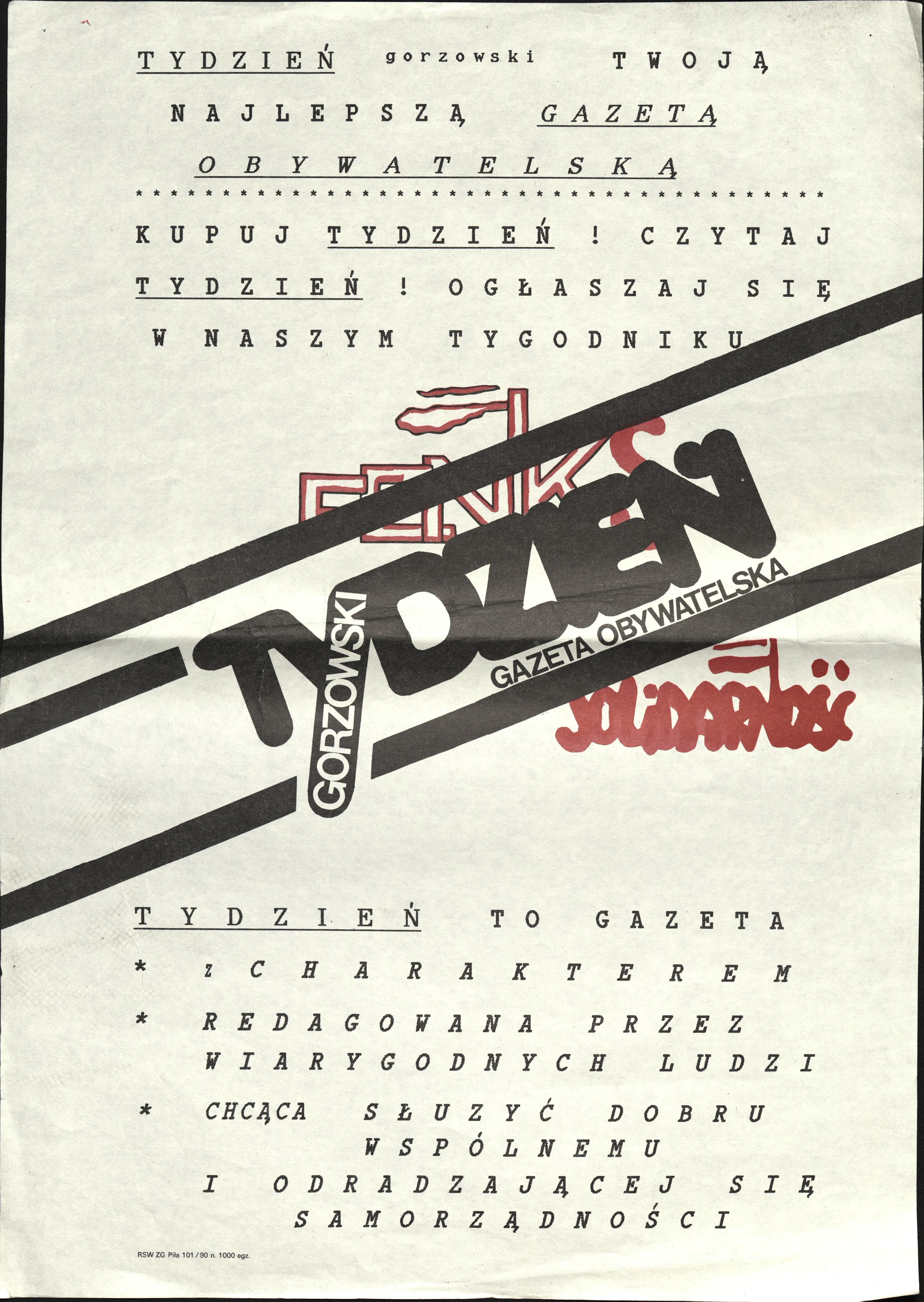 Plakat informujący o nowym tygodniku "Tydzień Gorzowski", reklamujący się jako najlepsza gazeta obywatelska