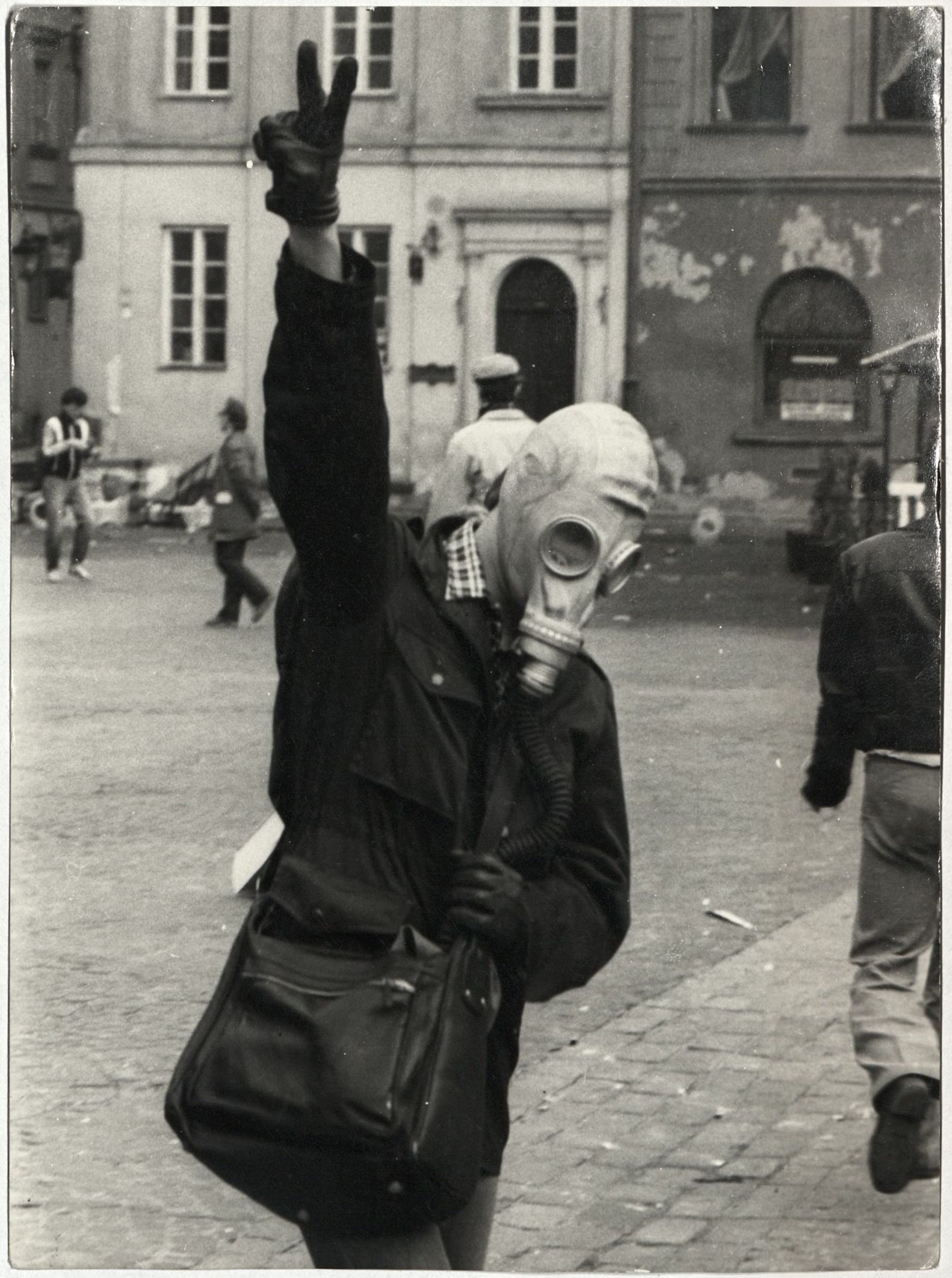 Fotografia ukazuje demonstranta w masce gazowej. Jest on uczestnikiem demonstracji zwołanej z okazji 11 listopada - Dnia Niepodległości Polski, którego władza nie pozwalała celebrować i którego nie uznawała.