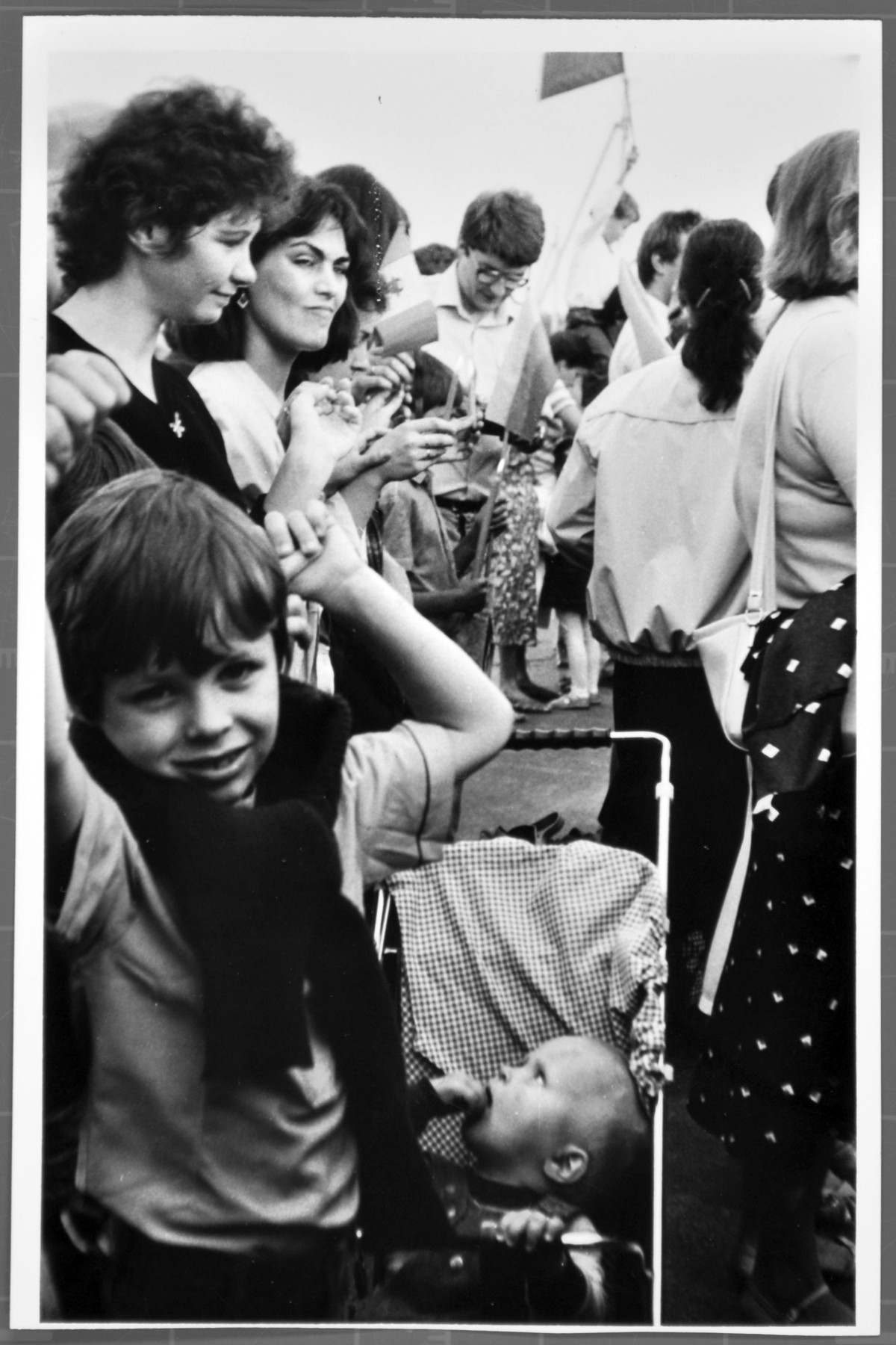 Nuotraukoje du vaikai, stovintys Baltijos kelyje.