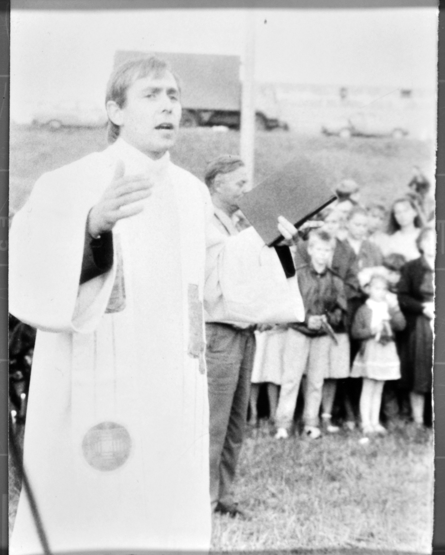 Nidos klebonas laiko mišias Baltijos kelyje netoli Pasvalio.