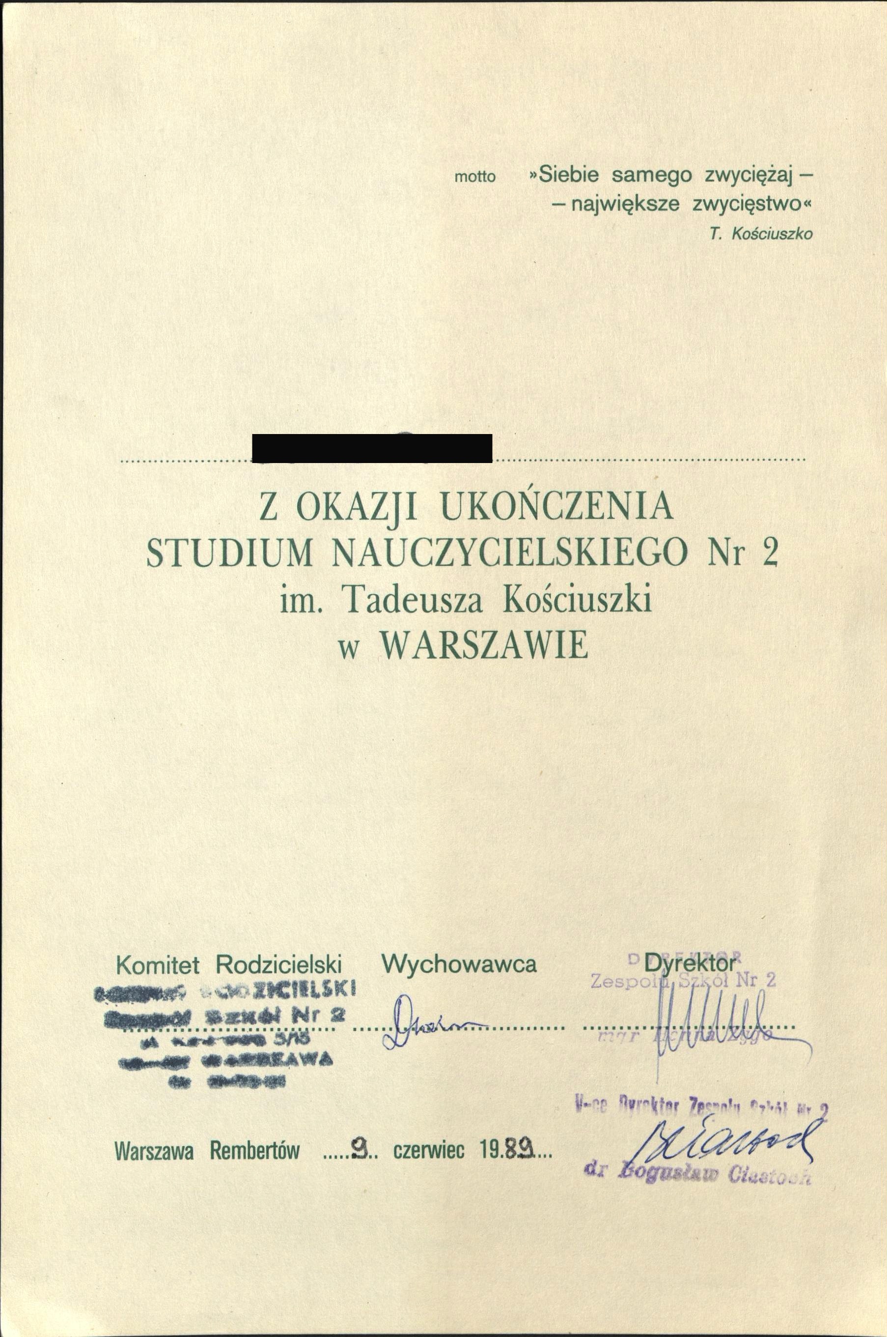 Pamiątkowy dyplom ukończenia studium nauczycielskiego nr.2 im. Tadeusza Kościuszki w Warszawie