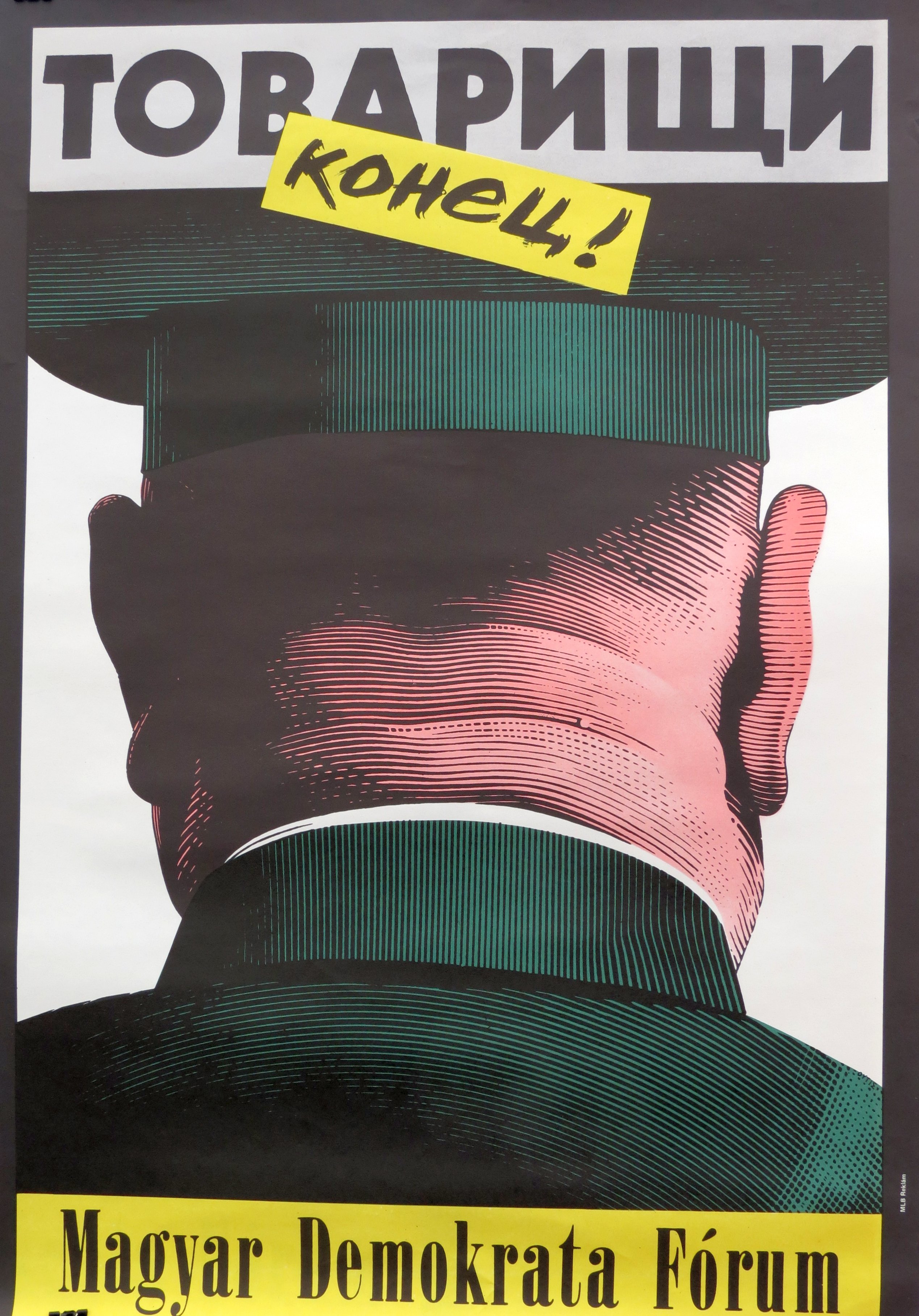 A3-as méretű, színes, papír plakát, rajta orosz felirattal (Tovarisi konyec).